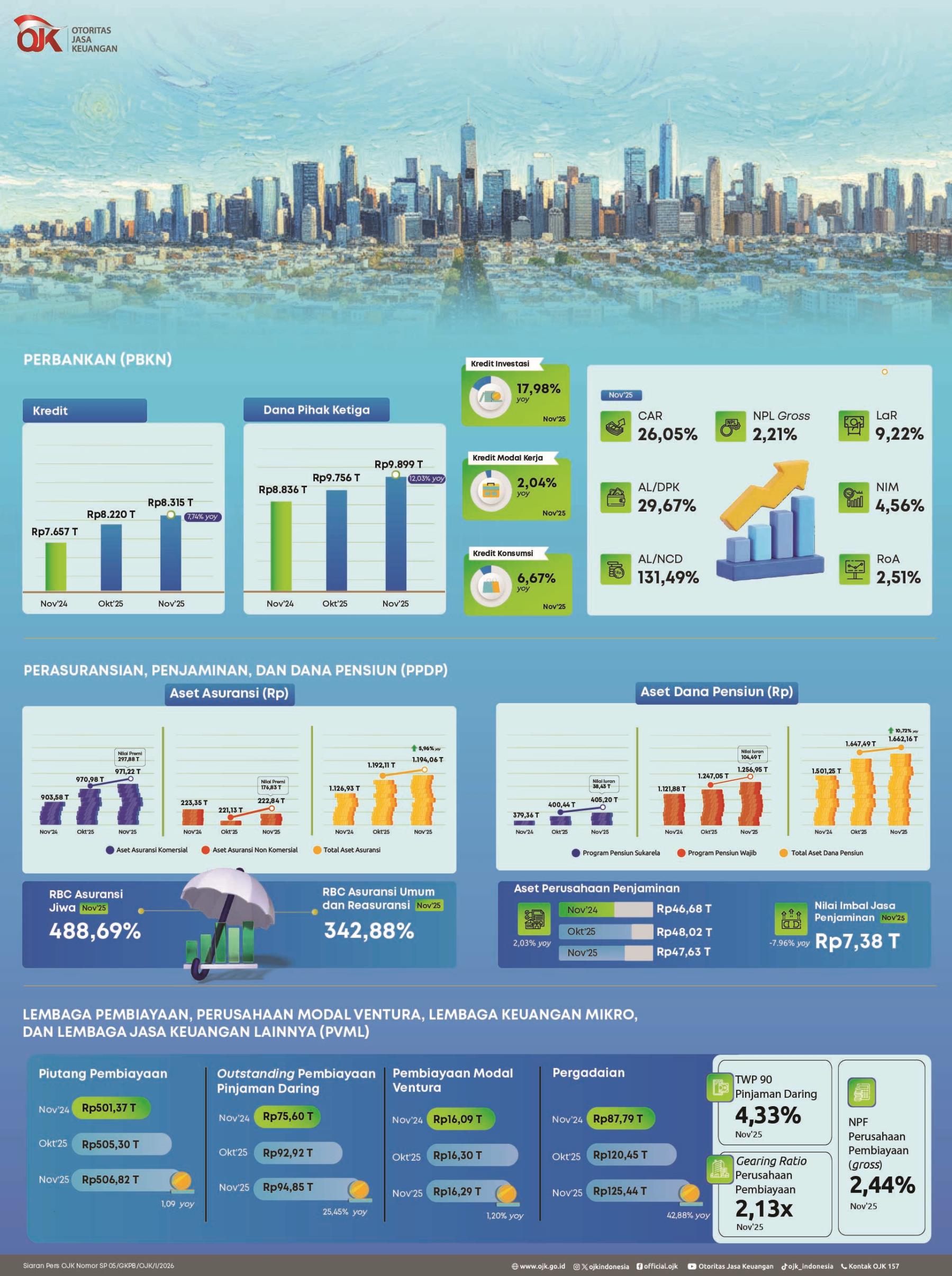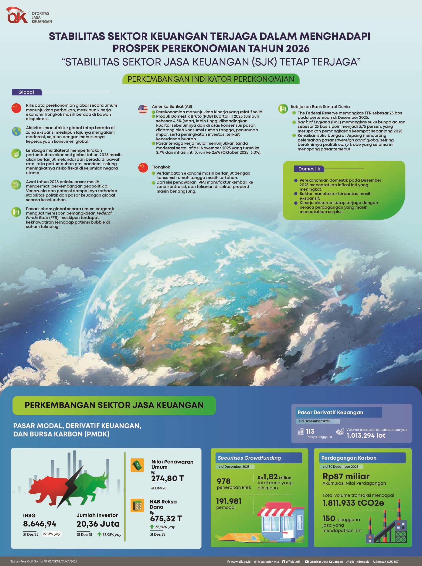 Rapat Dewan Komisioner Bulanan Otoritas Jasa Keuangan (OJK) pada 24 Desember 2025 menilai stabilitas Sektor Jasa Keuangan tetap terjaga.